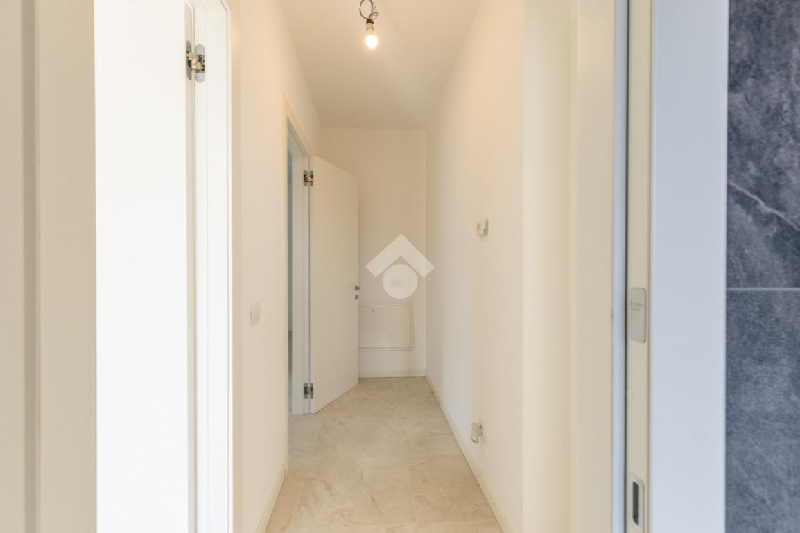 L’ingresso si apre su un luminoso soggiorno con cucina a vista, caratterizzato da ampie vetrate che affacciano sul verde. La zona notte ospita due camere da letto e due bagni finestrati, entrambi rifiniti con materiali di pregio.